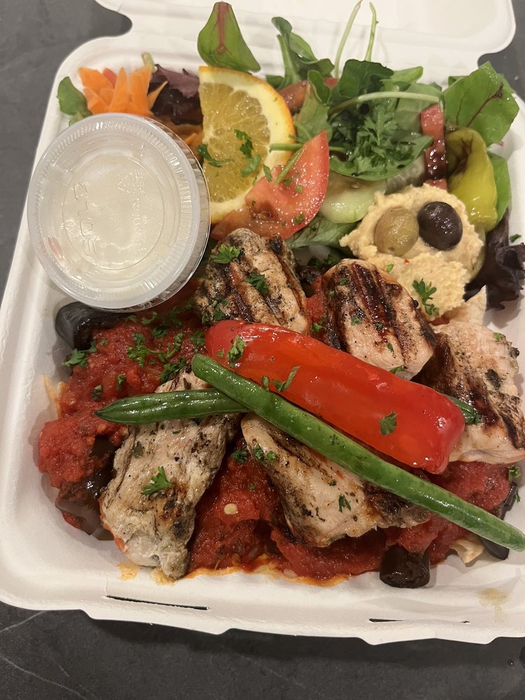 Sauteed chicken, mushrooms and tomato sauce and baked in a casserole. Served with salad and rice.